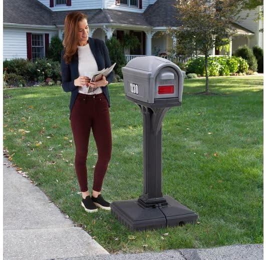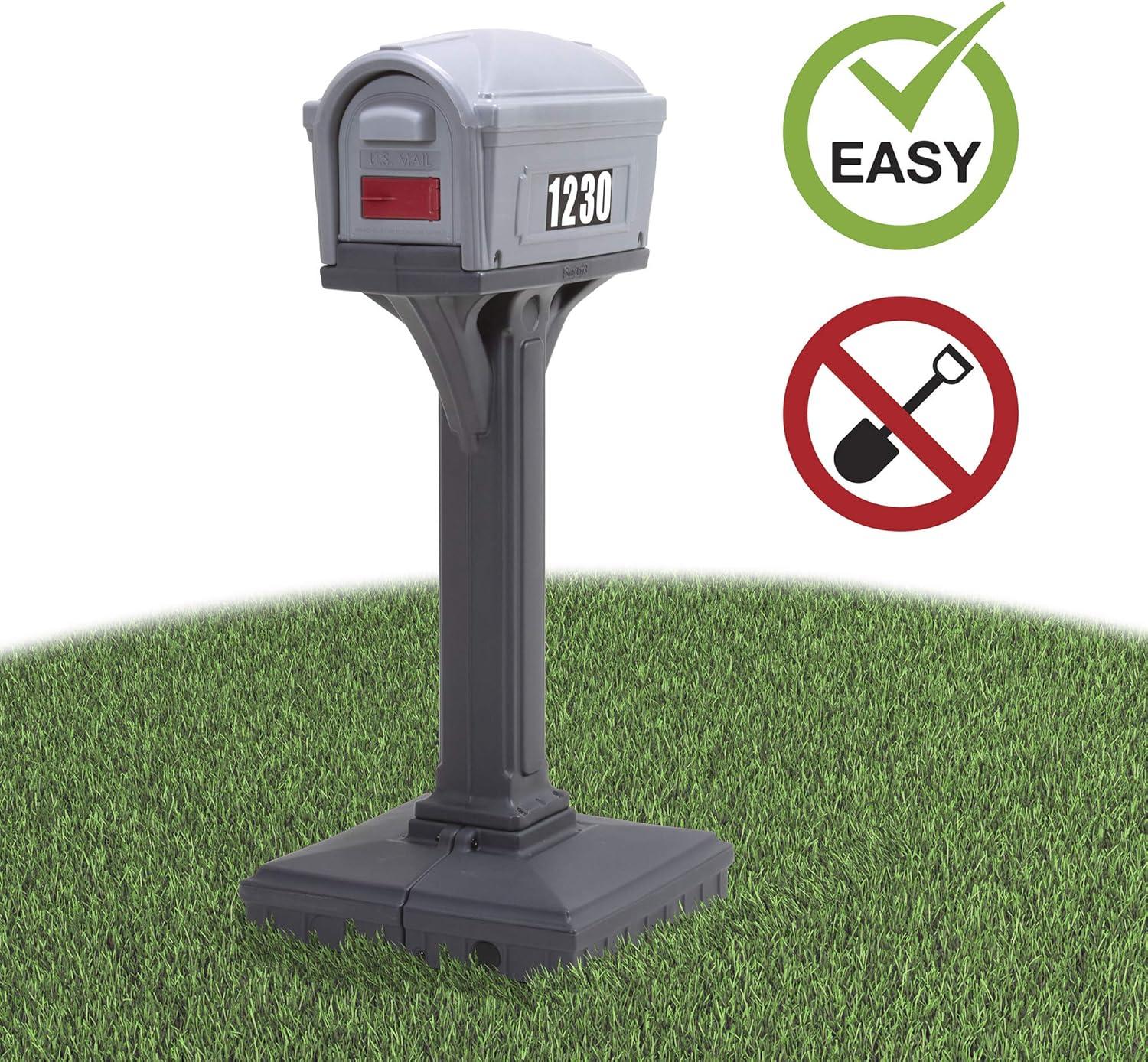 HASSLE-FREE INSTALLATION: Easily install in under 30 minutes in just three steps with patented design; simply assemble, fill the base with up to 100 lbs of dry sand (not included), and set the plastic mailbox in place without digging a post hole